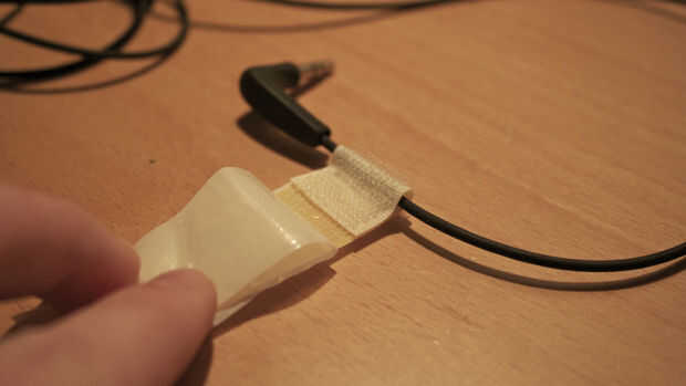 La siguiente cosa a hacer es cortar un trozo de velcro en el rollo y fije el cable. Hacer un pequeño lazo en el cable y conecte el extremo a la pieza de velcro sí mismo (el cuadro explica mucho más que mi senderismo).