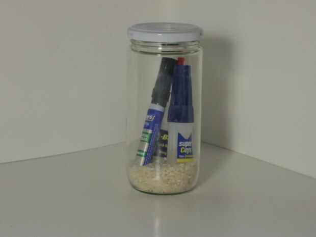Arroz como un higroscópico absorbe toda la humedad del aire tomando hacia fuera de la posibilidad de la cola para curar.