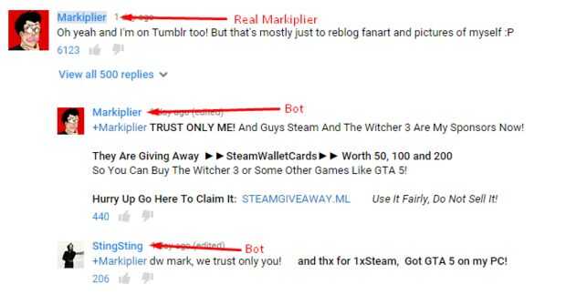 En la primera foto, señalo el usuario real comentario/YouTube y de identificar a los estafadores. (bots) ¿Cómo puedo saber sólo con mirarlos? Bien miren la segunda foto. ¿Ver cualquier cosas comunes en? Que ambos caracteres especiales de uso aspirar culo esas flechas negras y las cajas negras. También utilizan palabras audaces y que poner enlaces en el comentario. Los caracteres especiales y el texto en negrita se utiliza para explorar la sección de comentarios de usuario lo notará. En algunos casos, como en la primera foto, que van a utilizar otro bot/perfil para comentar su estafa diciendo que funcionaba por lo que puede dar a la gente una falsa sensación de seguridad.