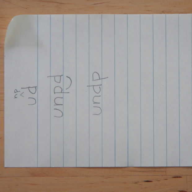 Examinar las formas de sus letras. Tratar de leerlos en voz alta, de abajo hacia arriba, utilizando los términos tiro/catch e izquierda/derecha. Por ejemplo lee del PNUD , "tiro a la izquierda, tiro de derecha, izquierda, captura captura derecha.