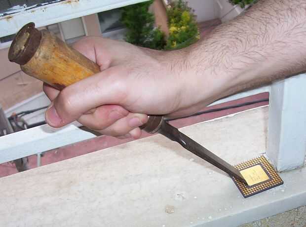 Luego, coloque el borde del cincel exactamente en el punto donde la cubierta de metal con la parte inferior de los envases cerámicos de CPU. Se debe mantener un ángulo menor de 45 grados, (más pequeño que se muestra en la foto), con el fin de evitar romper el embalaje de la CPU. Usted tenga que doblar las patas para colocar el cincel en un ángulo pequeño.