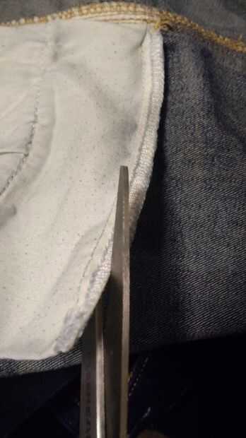 La primera vez que usa a un extractor de puntada que funciona mejor, pero la segunda vez que no tengo uno así que utiliza tijeras para cortar lo suficiente que se abre. Tratar de preservar tanto el bolsillo original como sea posible. Tratar de cortar lo mas recto posible. Soy terrible en esto.