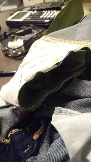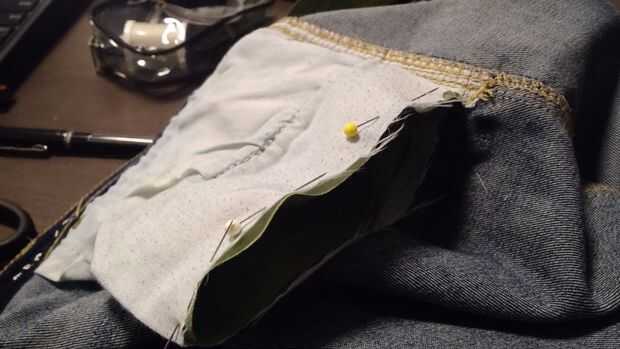 Tomar rectos pernos y pasador al borde del nuevo material de bolsillo hasta el borde del material antiguo de bolsillo. Empuje el resto del nuevo material de bolsillo dentro del bolsillo viejo. De esta manera cuando termine de coser, la costura áspera será visible para usted (cuando los pantalones están adentro hacia afuera) pero que no sienta que cuando usted ponga su mano dentro de su bolsillo.