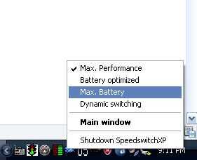 Le da la opción para fijar la batería máxima. Este ajuste reducirá la velocidad de la CPU a la mínima que se pueda. En mi caso se trata de 800 MHz. Sé que esto suena ridículo, pero esto es realmente una velocidad muy usable. Puedo ejecutar Media Center y reproducir mis programas favoritos de TV y olvidar que estoy corriendo a una velocidad reducida. Esto también es bueno para el procesamiento de textos y jugar juegos simples.