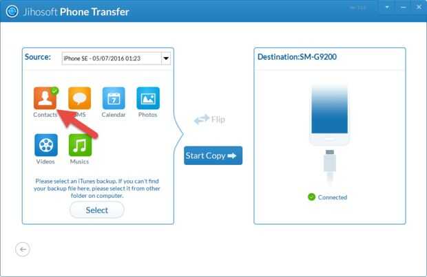 Haga clic en el icono del tipo de archivo que desea transferir. Contactos, por ejemplo.