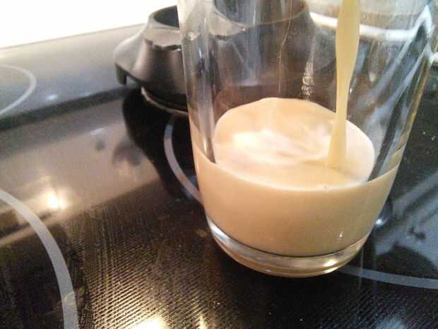 Capas de lugar cuatro de paño de queso en un vaso verter parte de la mezcla aguada en el paño de queso.
