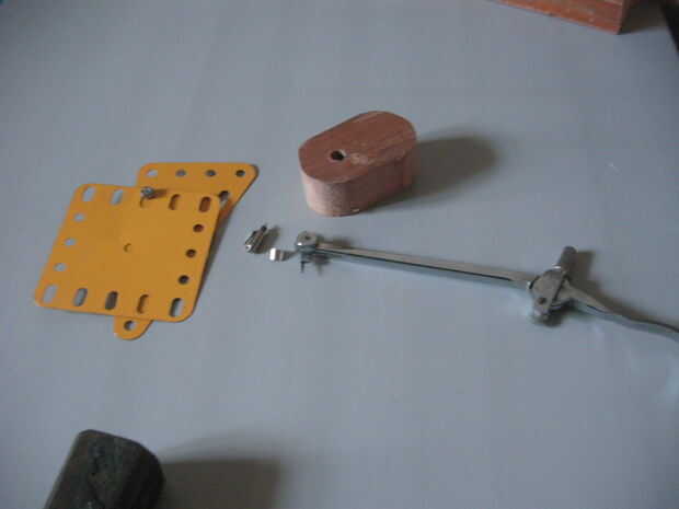 Haz un par de placas de Meccano, una brújula desechada, un mecano tuerca y perno, un bloque pequeño de madera, con un agujero perforado en él...