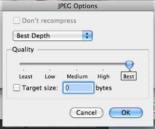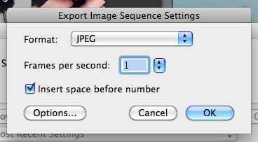 Haga clic en el botón "Opciones" y en el nuevo menú de comando Asegúrese de que su formato es JPEG o un formato que te guste, y que dice 1 en el campo de "Fotogramas por segundo." Luego haga clic en "Opciones..." y asegúrese de que es barra de control deslizante en la ranura "Lo mejor".