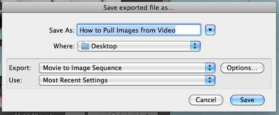 En la nueva ventana de comando debe tener la habilidad de cambiar donde guarda, siempre hago "Desktop", y debe exportar como una "película a secuencia de imágenes"