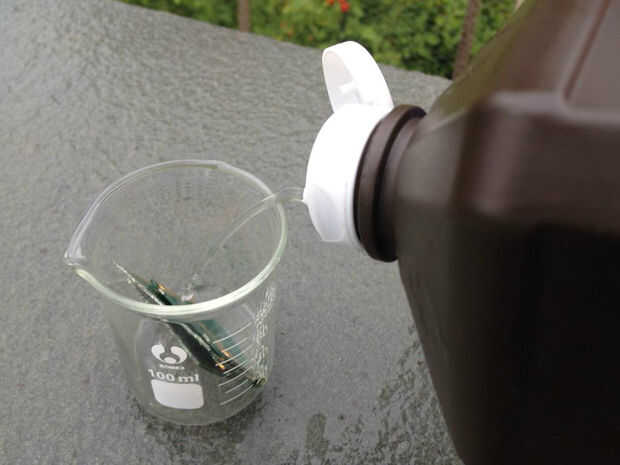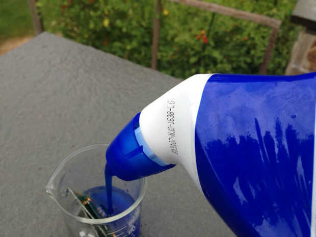 En este paso, usted tome el peróxido de hidrógeno y la taza del inodoro limpiador y mezcla a partes iguales de cada uno con suficiente solución total para poder sumergir completamente el PCB. Después la solución se ha hecho, los PCB de la gota y asegúrese de que estén completamente sumergidos.