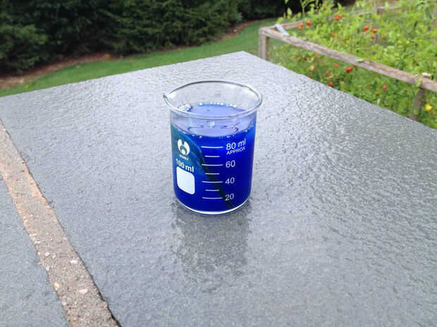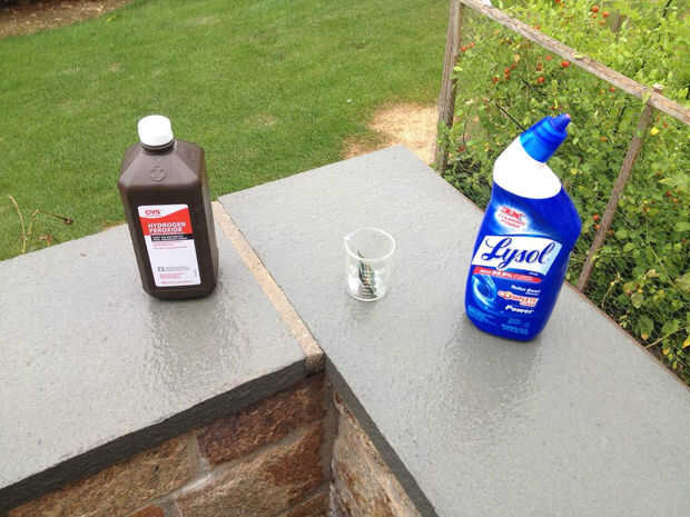 ADVERTENCIA: Esta es la parte más peligrosa como se liberan pequeñas cantidades de cloro gas (dependiendo de las concentraciones de de los productos químicos utilizados. Estoy usando peróxido de hidrógeno 3% y la taza del inodoro limpiador es 9.5% de ácido clorhídrico). Asegúrese de que está fuera o en una zona muy bien ventilada y con el equipo de seguridad adecuado.
