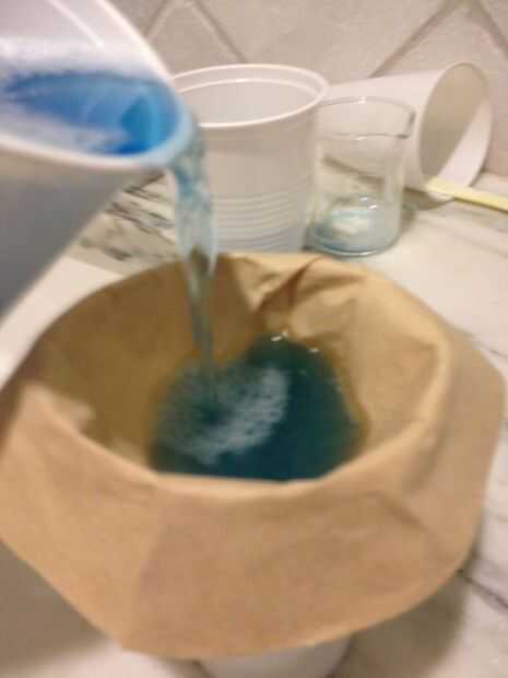 Después de filtrar todo el oro, vierta el exceso de agua en la botella de residuos peligrosos que se desecharse de manera correcta y Continué haciendo correr agua regular a través del filtro para limpiar el oro.
