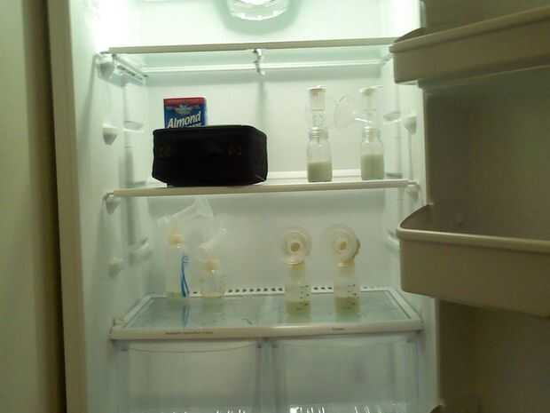También puede colocar sus piezas bombas y leche en un refrigerador con hielo después de su última sesión de extracción, por lo que no necesitará volver a la sala de bombea y posiblemente interrumpir sesión de otra persona.