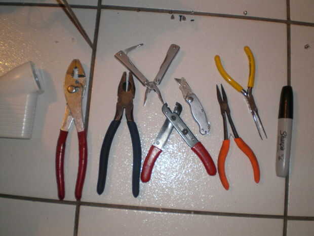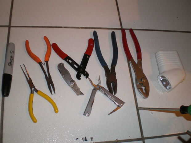 debe hacer bien, sin embargo, incluí un rotulador para marcar los puntos de conexión, y coloca una linterna a ver oscuro. También se aprecia una copia barata de leatherman.