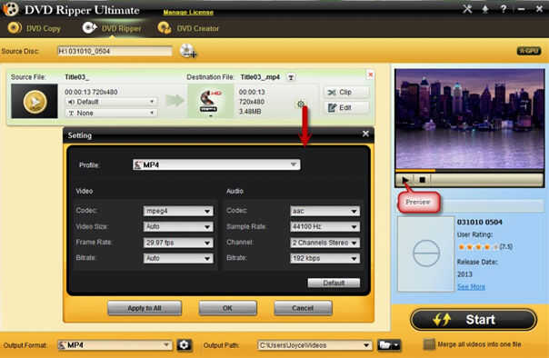 Este paso es opcional, si desea mantener la originalidad de la película, simplemente omitirlo. Para aquellos que deseen personalizar los videos convertidos de DVD este DVD al convertidor de iTunes ofrece además algunas funciones de edición útiles. Puede restablecer el códec, el tamaño del vídeo, frecuencia de muestreo, fotogramas, canal de Audio, así como Bitrate de vídeo/Audio, etc. para hacer tus vídeos más agradable. Y también puede hacer clic en el botón "Clip" y "Editar" para editar vídeos por recorte, recortar, añadir subtítulos, marca de agua y ajuste brillo, Hue, saturación o contraste. También, puedes escuchar videos en la ventana de previsualización.