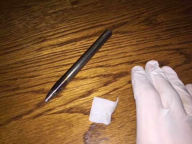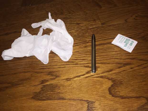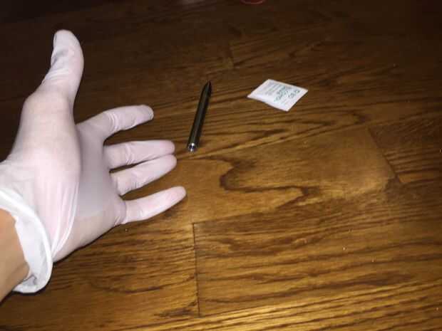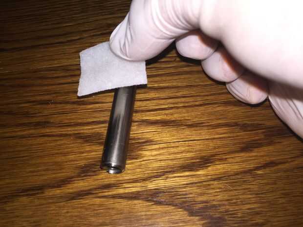 Ponga en sus guantes de goma para evitar cualquier huellas dactilares en el titanio, después se limpia. Luego limpie abajo de la pieza de titanio con el alcohol hasta que es muy limpio.