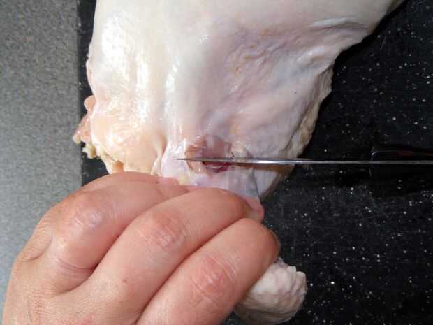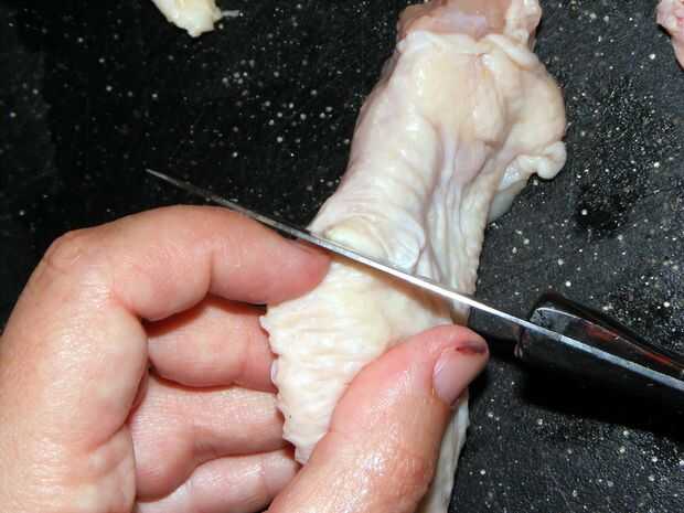 Es más fácil cortar la drummie y parte plana. Doble hacia arriba y se puede sentir la articulación en la parte superior. Cortar a través de ella un poco, luego poner el cuchillo en el lugar donde dobla y corte. Su cuchillo irá generalmente a través de la articulación, menos resistencia.