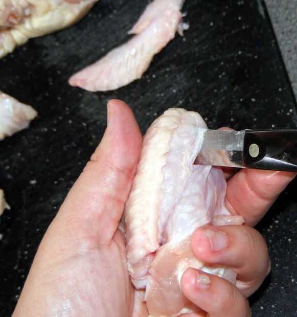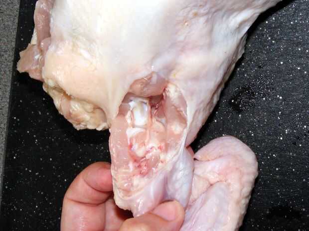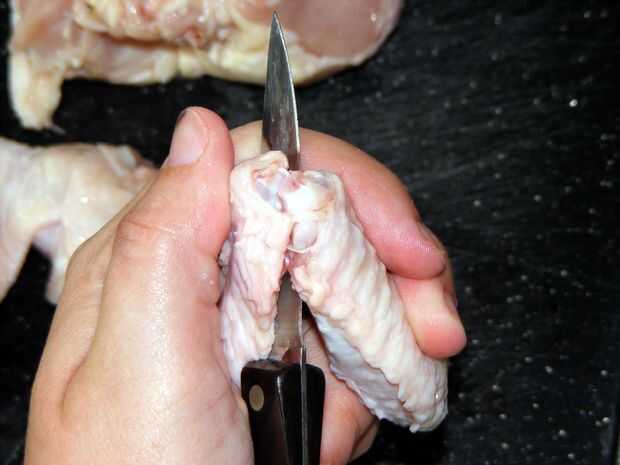Sentir y usted puede conseguir el dedo de la articulación del ala. Es la idea de hacerlo de esta manera. Deje que el pollo le muestre dónde cortar. Siente el corte conjunto entre los dos huesos y vas cortando a través del cartílago suave o si tu suerte te lo puedes perder todo, cortar tendones y ligamentos para una separación limpia. Cuando a través de la articulación, solo corte a través el músculo y la piel y está apagado!