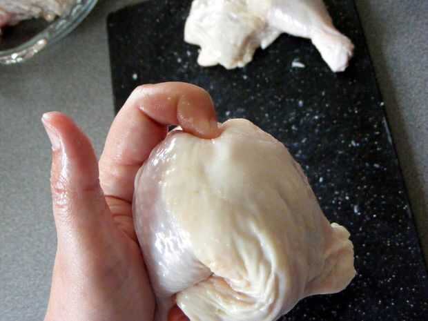 Tire de la pierna lejos del resto del pollo. Corte suavemente a través de la piel para que podamos ver lo que estamos trabajando con el.