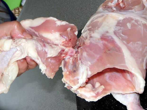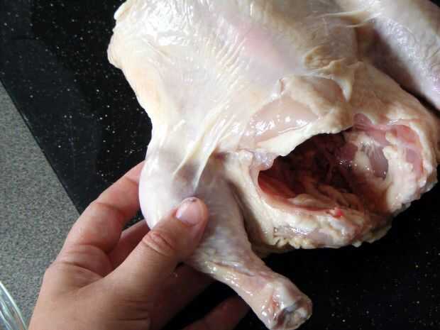 Usted puede dejar la pierna y el muslo juntos para cuartos pero a separarlos. Cortar como lo hizo con el ala. Doblar para arriba, siento por la articulación, reducir en el empalme entonces para arriba a través de la articulación y ésta se realiza.