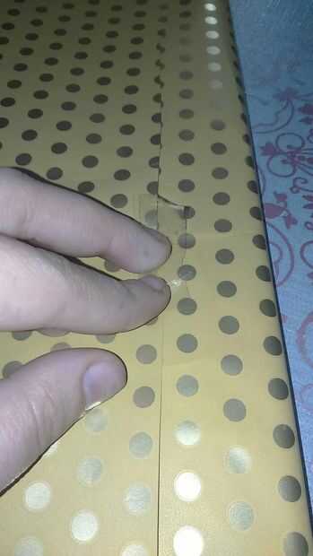 Pegar papel a la caja de libro con cinta scotch de embalaje. Que palo de lado izquierdo de la misma manera. Pegar la cinta scotch en más lugares, especialmente en el final. Doblar el extremo como en la fotografía. Luego doblar de nuevo, así que tienes dos triángulos. Doblar por la mitad y, si hay necesidad, doblar otra vez en medio. Luego pega como en cuadro 7.