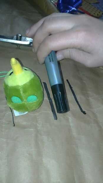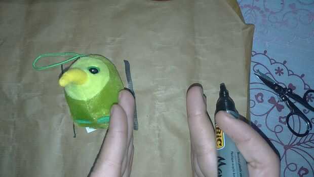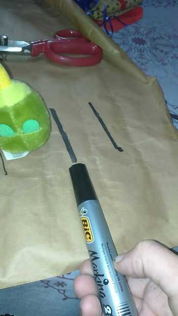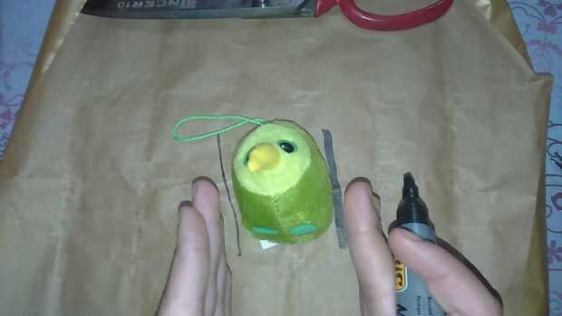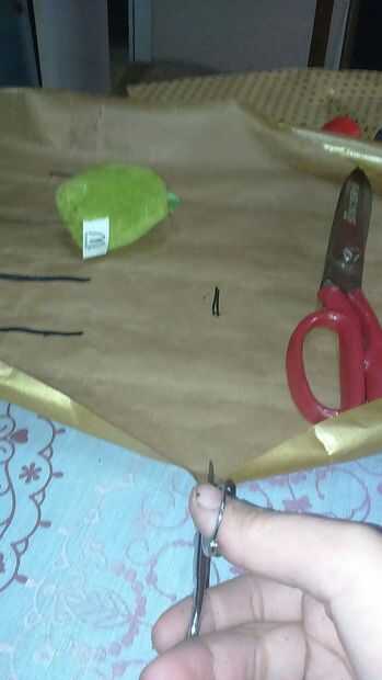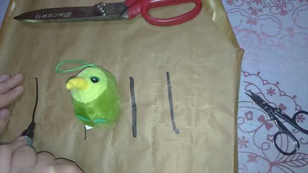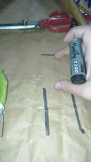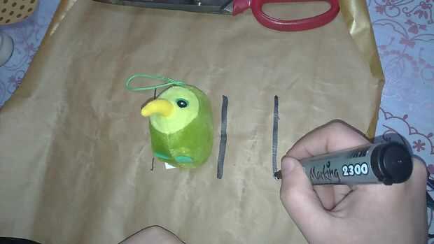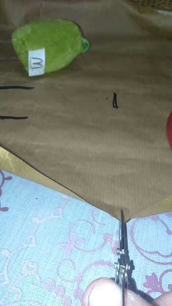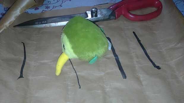 I have stuffed animal. Poner en el papel de embalaje y marca la medida del animal y el medio en ambos lados. Ver en las fotos. Luego cortar la medida.