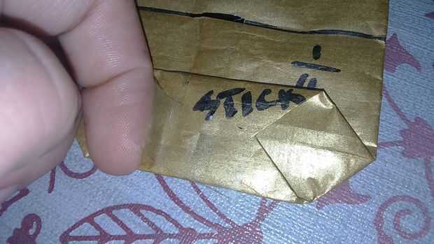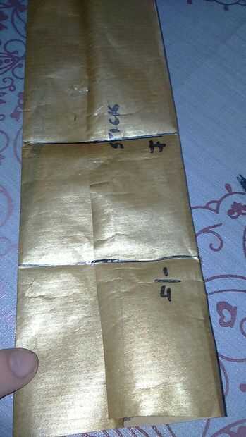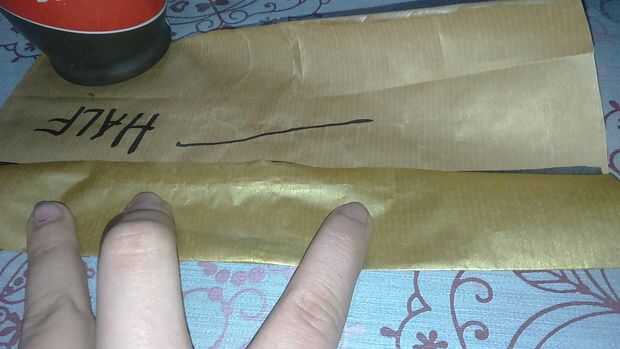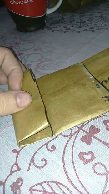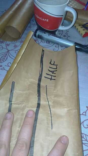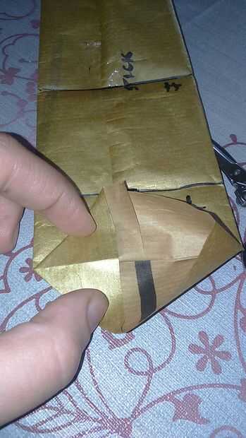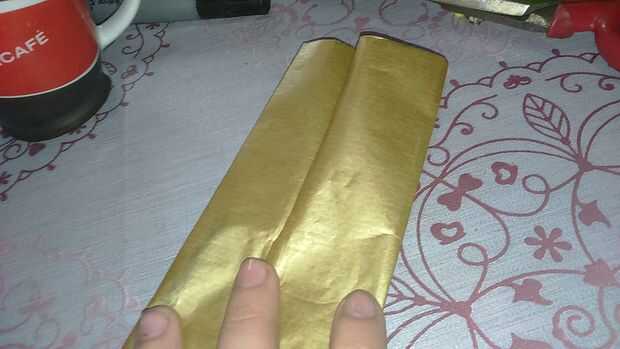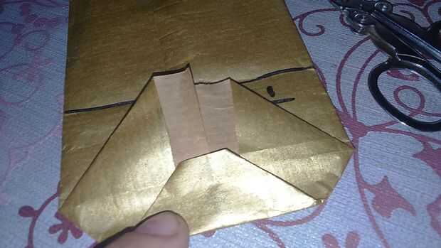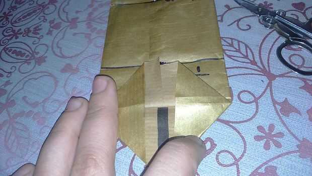 Find a half and fold both sides. Pegue con cinta scotch. También puede hacerlo con pegamento para el papel. Encontrar el medio y doblar el extremo en un cuarto. Abrirlo y hacer dos triángulos. Doblarlas y pegarlas. Todo lo que en las fotos Marque porque no tengo cámara buena y no puede ver los pliegues.