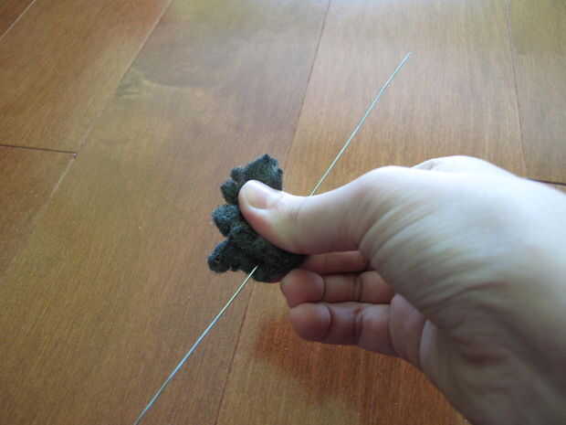 Básicamente todo lo que necesitas hacer es enderezar el alambre con los dedos, pero mina ha sentado alrededor de en mi mochila para un año o así, por lo que es bastante sucio. Estoy utilizando la lana de acero para limpiar el cable de tierra y cosas que se ha acumulado tanto pulirlo un poco. De hecho, el objetivo aquí no es realmente enderezar el alambre, que deshacerse de cualquier torceduras que están presentes (aunque si su cable insiste en enrollar un montón, alisado ayuda a mantener su cordura intacta).