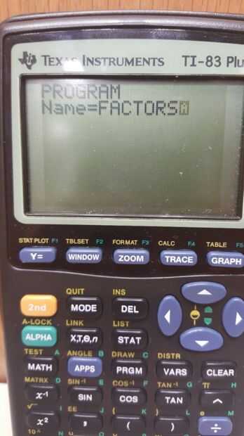 Comenzar seleccionando el botón PRGM y desplácese en nuevo, haga clic en ENTER y el nombre del programa y haga clic en Intro. Con el nombre se relaciona con la fórmula es siempre una buena idea. (Ejemplo: factores)