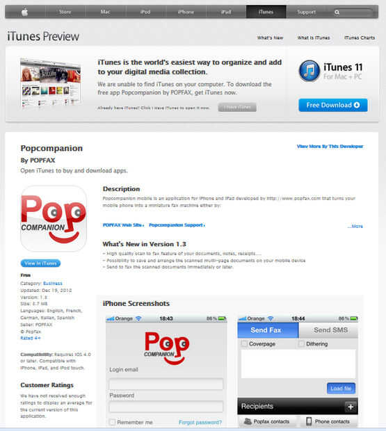 Puede descargar Popcompanion móvil fax app desde iTunes