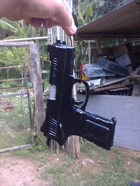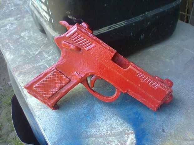 No meu caso, pistola inteira foi pintada em preto fosco, com apenas un abertura para os cartuchos vazios em prata, e no só carregador (foi feito mesmo jeito que una pistola) una parte interna foi pintada em prata, e ningún cartucho, un ponta prata e o resto em dourado ou cobre