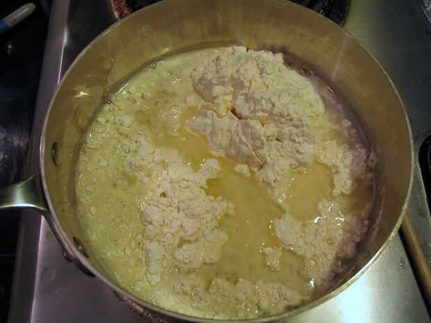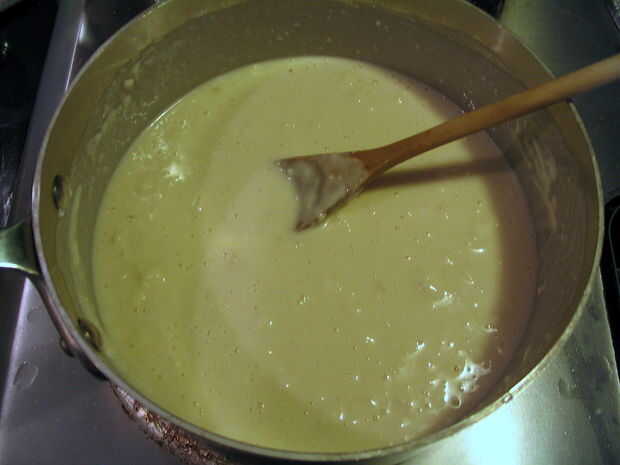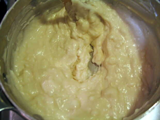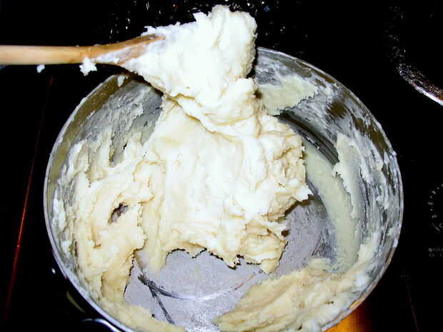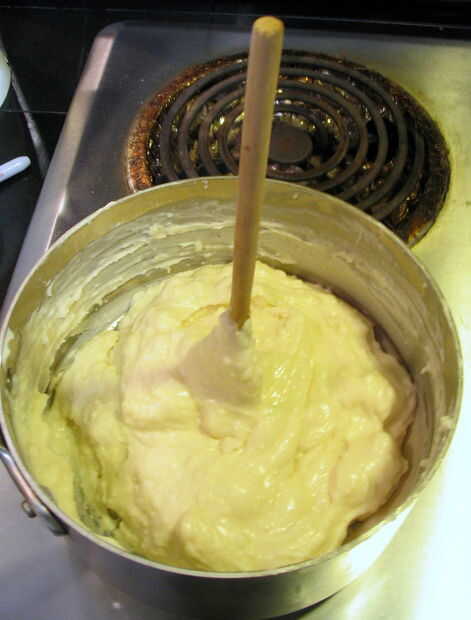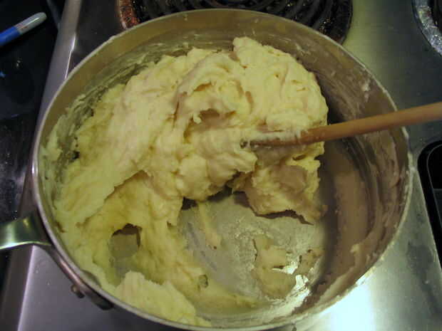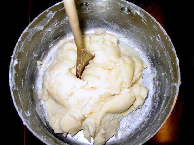 Quando un massa se afastar dos lados e aglomerar no centro, como herencia abaixo, retirarse a panela fogo e deixe un manipular de massa esfriar o suficiente para.