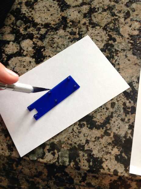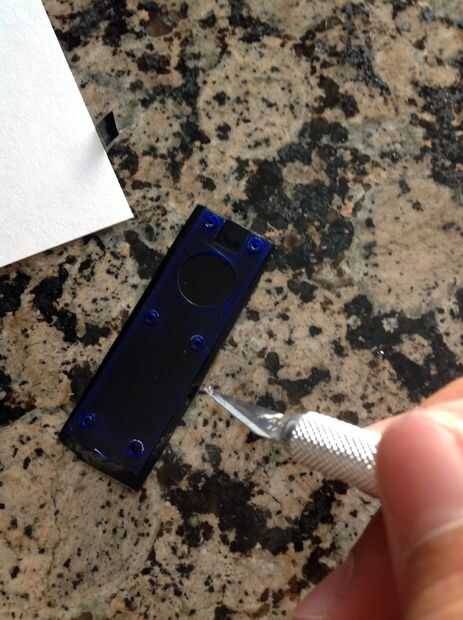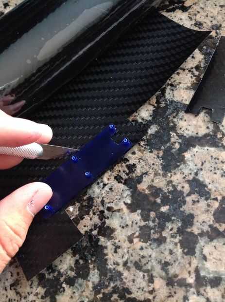 Puesto que mi objeto es plano, es muy fácil de aplicar el vinilo de fibra de carbono. Coloque en la fibra de carbono y corte alrededor de su artículo, asegurándose de dejar un poco de vinilo en los bordes por lo que puede ser recortado exactamente. Después de cortar la forma, limpiar el objeto y el vinilo se aplica a él. Luego, cortar exceso de vinilo usando el objeto como una plantilla. Si haces algo que tiene partes redondas como una capilla del coche, caja del teléfono, use un secador para hacer el vinilo más flexible que se ajusta a los bordes redondeados. Si se envuelve algo más que no desea tomar aparte puede hacer una plantilla usando papel y más arreglarla hasta que es exacto y luego aplicarlo. Si tienes agujeros que necesitan para corte de vinilo (por ejemplo, el agujero de botón en mi proyecto) Utilice el borde del agujero para cortar la pieza de revestimiento.