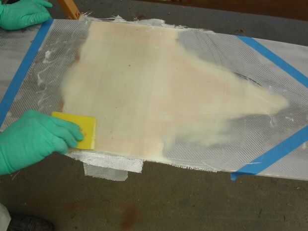Una vez que la fibra de vidrio ha sido completamente saturado con resina interruptor del cepillo a la traílla, y como se aplicaría compuesto de juntas en la pared, use el raspador para aplicar una fina capa uniforme de la resina en la fibra de vidrio. Trabajar desde el centro de la pieza al perímetro de su trabajo. Ser conscientes de las burbujas o dobleces en la fibra de vidrio como intenta establecer la capa de fibra de vidrio como suave y uniformemente como sea posible.
