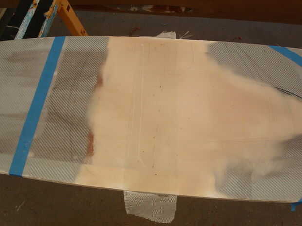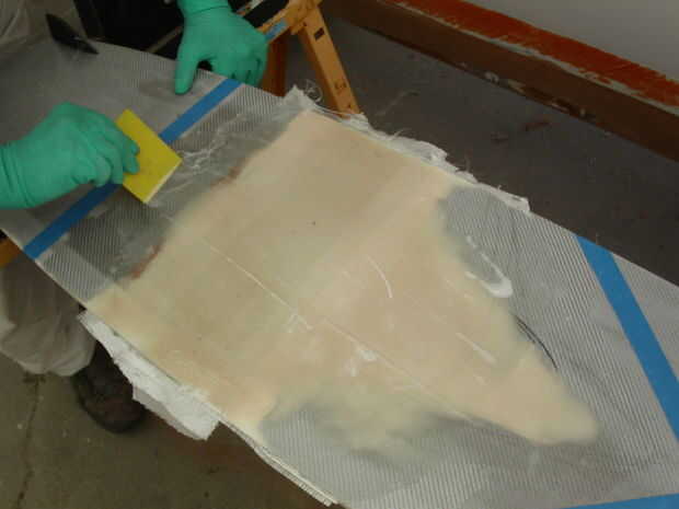 Una vez que la primera capa estaba abajo comenzamos a más fibra de vidrio en la parte superior de la capa. Cada capa sucesiva no requiere mucha resina como la capa anterior lo hice desde allí es generalmente exceso de resina hecho del proceso de rascado.