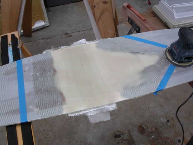 Utilice la lijadora para hacer todo tan suave como sea posible. Incluye difuminados suavemente la resina en los bordes de la zona donde la resina se encuentra con la superficie original del proyecto. También es un buen momento para recortar la fibra de vidrio exceso que sobresale por el proyecto. Sólo ligeramente lijado los rieles o lados de la superficie de proyecto tendrá la resina frágil llenada de extremos de la fibra de vidrio.