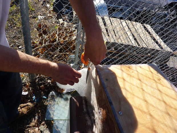 Estratégicamente colocar la hoja de fibra de vidrio sobre la madera y cortar esquinas.