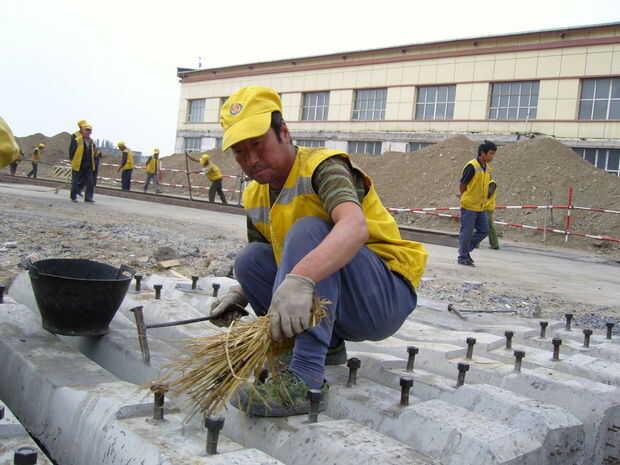 Para mantener la limpieza de los durmientes de ferrocarril, una pala plana puede usarse para limpiar hacia fuera la mezcla fuera de los orificios de la espiga. Y la mezcla extra puede ser reciclada en el bote para otro uso.