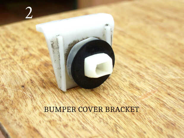 Foto 2 es el soporte de la cubierta de parachoques eliminado. Que busca en la parte posterior. Para retirarlo debe conseguir detrás del kit de alfombra en el tronco y darle la instalación Apriete un poco con pinzas o nariz de aguja. Hay una arandela de goma fina entre la pared del tronco y la parte posterior del soporte. Figura esta lavadora se ha deteriorado desde su condición original y esta no fue la mejor ingeniería. Además, el peso de la cubierta del parachoques saca el soporte de la pared exterior del tronco.