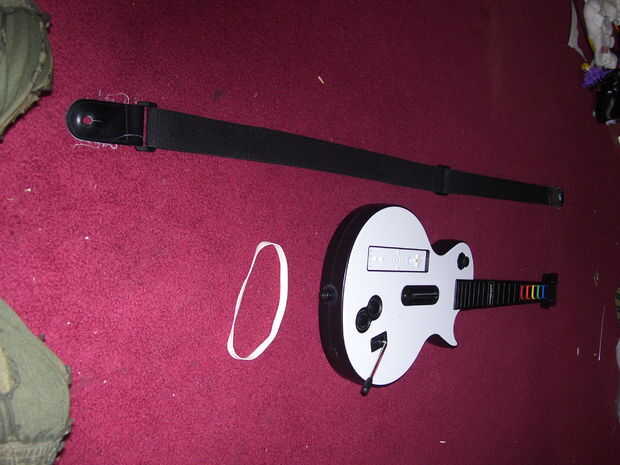 Mi novio tiene muchas guitarras, pero hasta hace poco, sin correas.Este es el prototipo de lo que una correa de guitarra sin necesidad de utilizar fijaciones de una correa previamente comprada (que encontrado común entre otras correas de guitarra DIY