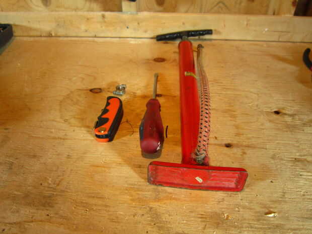 Bueno esta es la lamentable lista de herramientas y materiales:) 1 bomba de bicicleta rota 1 cuchillo para uso general 1 destornillador de cabeza plana 1 abrazadera pequeña