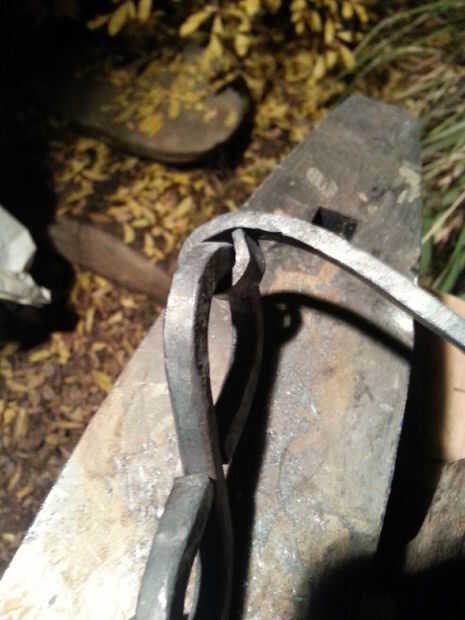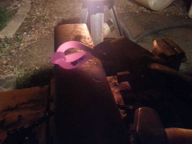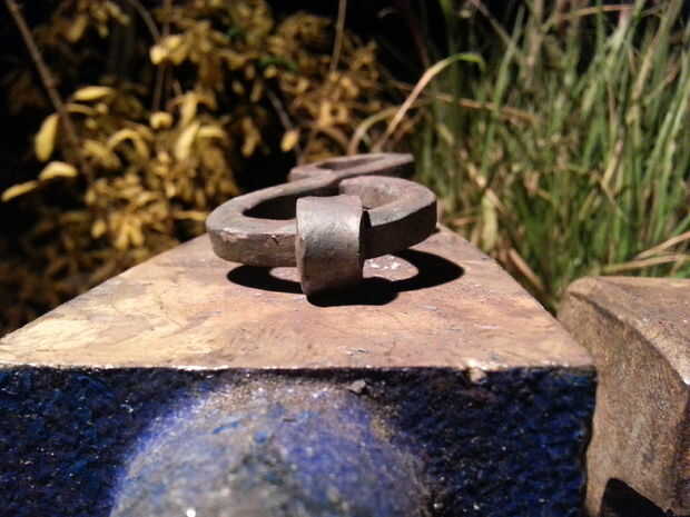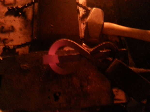 En primer lugar, calentar el gancho que irá alrededor de la base de la 8. Después que está caliente, deje caer el 8 en lugar y empezar a martillo el extremo del gancho hacia abajo.