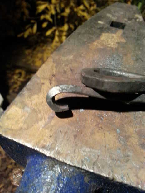 Puede utilizar la punta del cuerno del yunque la curva del anzuelo hasta el fondo. Una vez que el final empieza a doblar, colocar en la punta del cuerno del yunque. Golpee el gancho en el extremo opuesto del cuerno del yunque. Había marcado la primera imagen con la orientación del cuerno del yunque y el martillo sopla.
