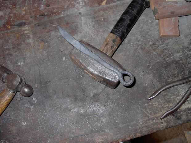 Forjar la hoja calefacción para arriba, sosteniéndolo en un ángulo para el yunque y oprimir la tecla para crear una forma de la lámina. jtobako tiene un instructable mucho mejor hacer el bisel. Una vez hecha la forma de la cuchilla, deje que se enfríe lentamente, y me refiero muy lentamente. Colgar en el aire si usted puede, o poner en un poco de arena. Si usted encuentra el significado en mi Descripción espantosa y ponerla en práctica, debe tener algo que se ve así.
