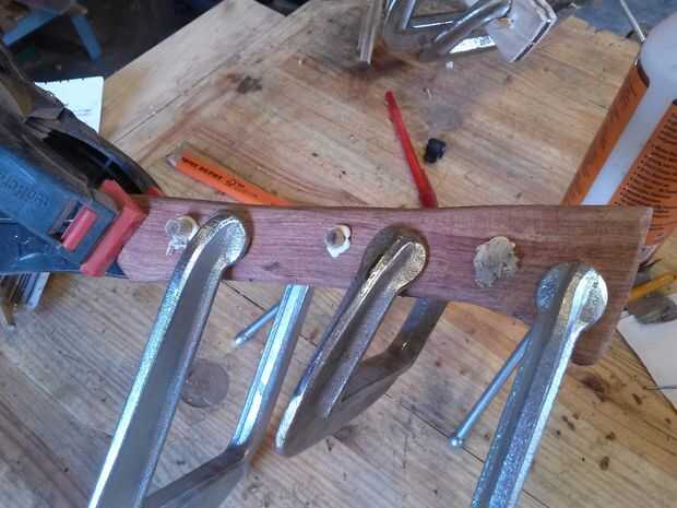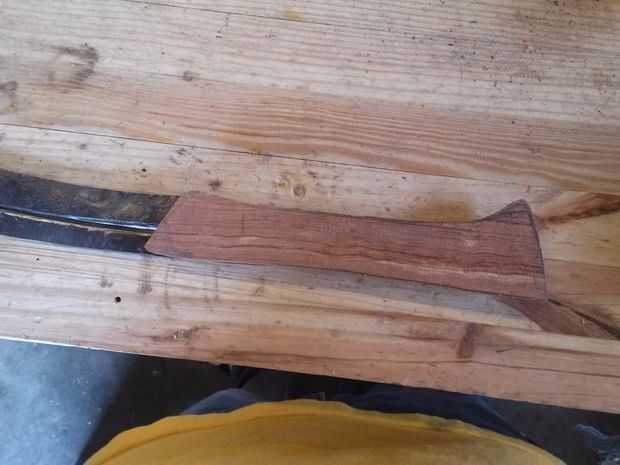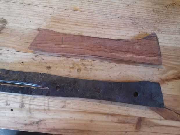 Luego, una vez que los mangos de madera que desee, almeja de la madera controla a la hoja de mango y perforar en él desde el lado del acero para que los orificios se alineen perfectamente. Entonces ese lado a la hoja de epoxy. Una vez seco el otro lado, sacar las pinzas, coinciden con mango de madera para el mango de la cuchilla y pinza y taladro los agujeros lanzaron los mangos de madera y de metal ya perforados y en la madera nueva de la manija para que los orificios todos coinciden perfectamente. Luego de epoxy al otro lado a la hoja así, fijarlo con la abrazadera y esperar hasta que se seca.