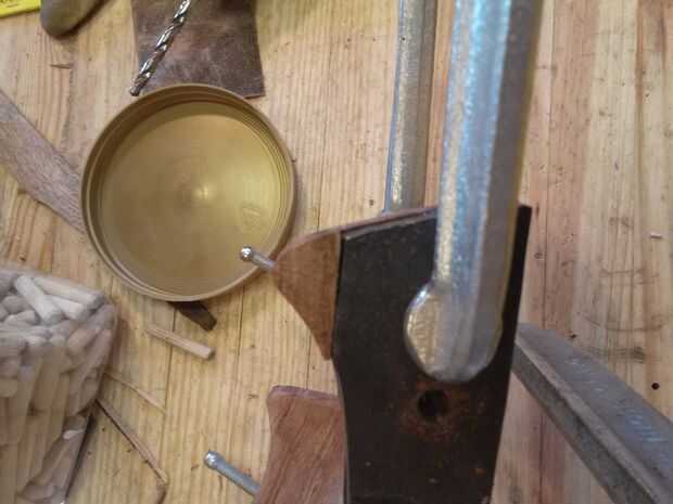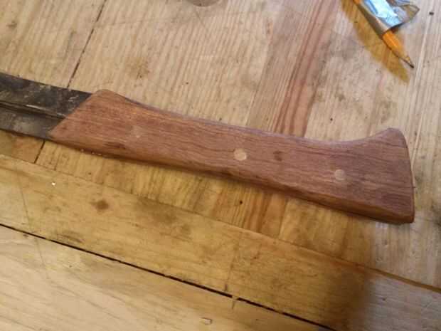 Una vez seca la manija (colectivo de los tres) poner un poco de pegamento en las madera carpinteros (pequeños tacos de madera) y un martillo a través del mango. Esto le da una fuerza extra todas las tres piezas de conexión. A continuación, cortar el exceso de las utilidades y lijar a nivelarse con el mango hacia abajo.
