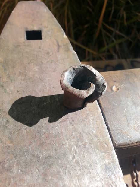 Después de que el pétalo se dibuja hacia fuera un poco, doblar el pétalo a lo largo. Usted puede elegir exponer tanto los pétalos como quieres para este Rizo, pero descubrí que doblarlo cerca de un tercio de la bajada de obras lo mejor. Este es el mismo para todos los pétalos. La forma más fácil de hacer esta curva es usar el martillo cruzado y golpea el pétalo en el interior esquina formada por la mesa de corte y la cara del yunque. La última foto es una que saqué de más adelante en la rosa para demostrar esto. También se puede utilizar la esquina de la cara del yunque si el yunque no tiene una mesa de corte.