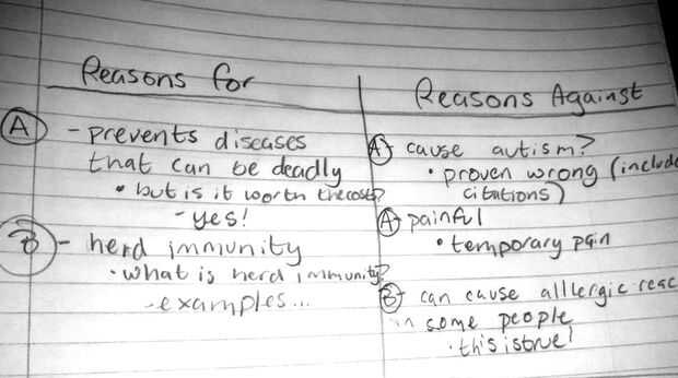 Con el fin de ayudarle a formar su argumento, categorizar cada punto en el gráfico basado en su información relevante. Como se muestra en el ejemplo anterior, algunos de sus puntos pueden interactuar uno con el otro muy bien y por lo tanto trabajarían juntos como un párrafo coherente. Sin embargo usted decide clasificar sus reclamaciones, utilice este paso para hacer las conexiones entre sus ideas para que usted puede pensar más claramente al empezar a escribir.
