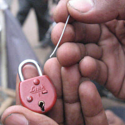 Necesita una cerradura pequeña y un trozo de alambre grueso. Corte el alambre en una franja de 3 a 5 pulgadas. Usted puede doblar la punta del alambre en un ángulo ligero. Ahora estás listo para escoger la cerradura!