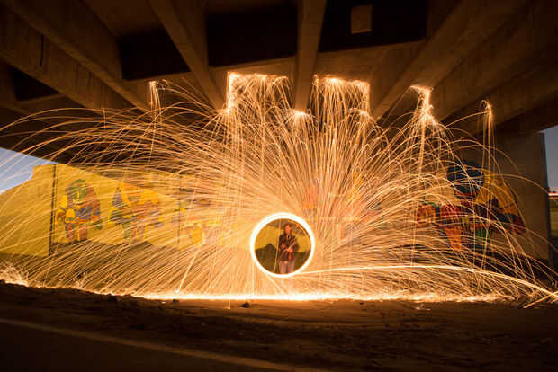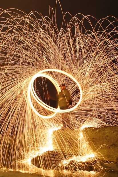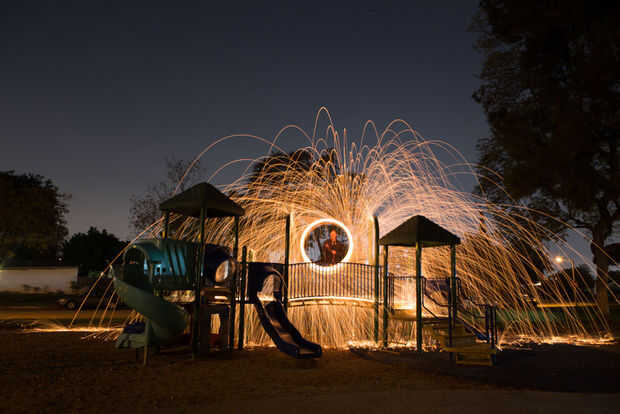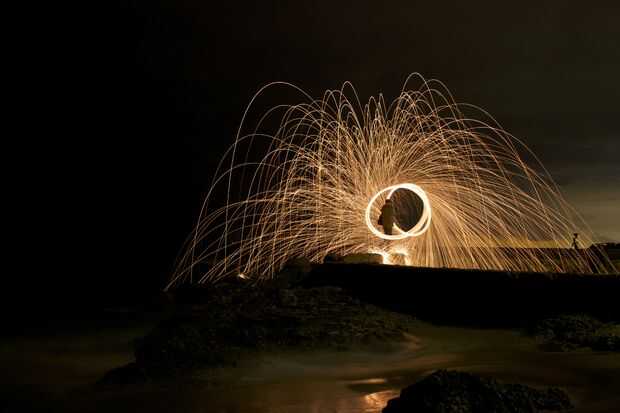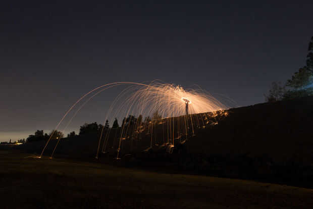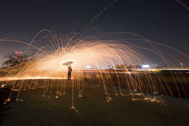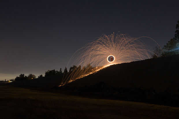 Después de reunir materiales, encontrar una ubicación y configuración de la cámara, saque una parte de la lana de acero de la caja y coloque en el extremo de la varilla (a veces ayuda a aflojar la lana de acero antes de relleno en la boca). Asegúrese de que usted conecte el cable/correa u otro elemento a la lana de acero del oscilación y batir todo. La lana de acero con batería de 9 voltios o un encendedor de la luz. Una vez que prende fuego o alerta alguien para iniciar la exposición larga o utilizar un control remoto para accionar la persiana para liberar.